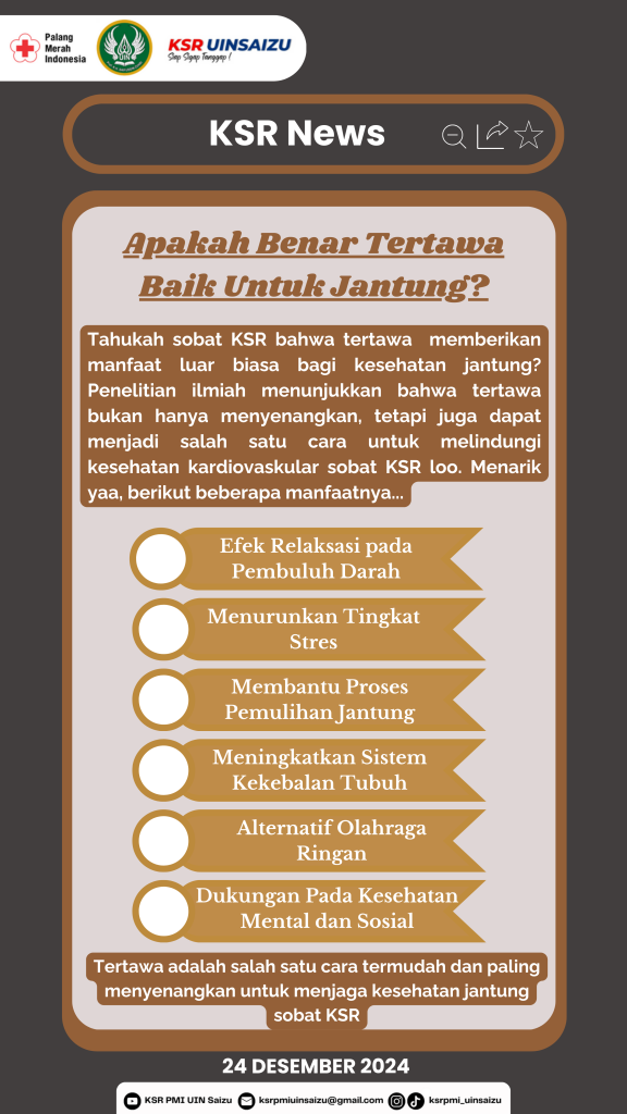 Tertawa Baik Untuk Jantung?Hallo sobat KSR di manapun berada🙌🏻 Jumpa lagi di website resmi KSR PMI Unit UIN Prof. K. H. Saifuddin Zuhri Purwokerto nih🥰 Kali ini kita akan membahas tema yang menarik. Penasaran?? Mari kita baca sampai selesai yaa😍 Enjoy and happy reading! 🤗