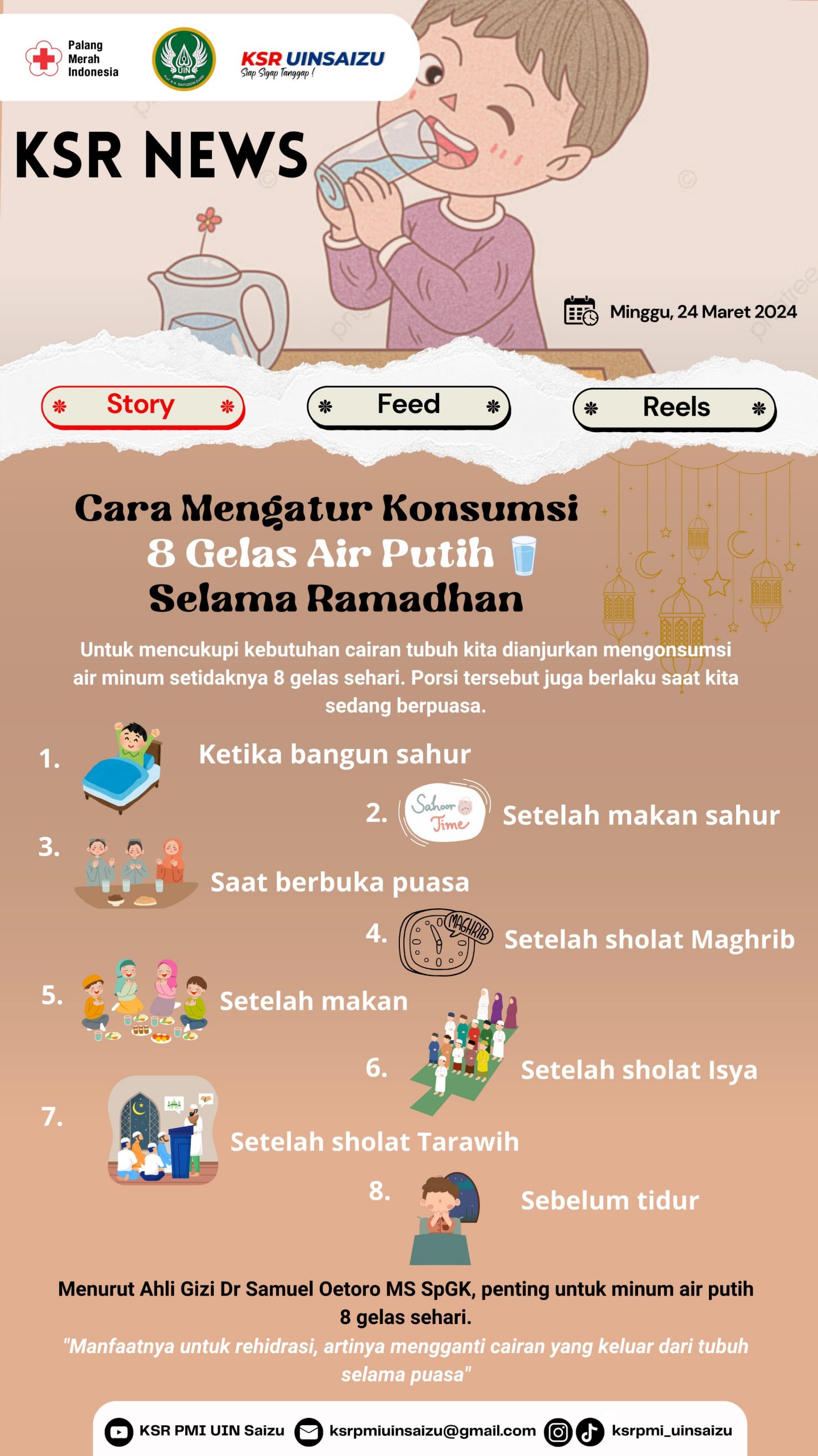 Dalam menjalani ibadah puasa Ramadhan, alangkah baiknya kita melakukan upaya-upaya untuk menjaga kesehatan tubuh untuk memenuhi cairan pada tubuh, salah satunya dengan minum 8 gelas air putih sehari atau lebih.