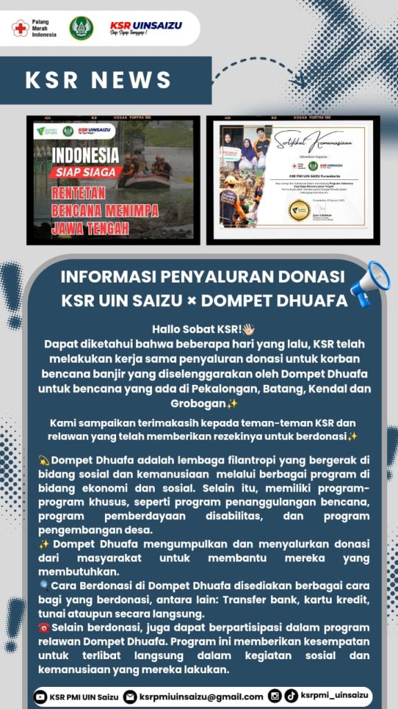 Kami ingin menginformasikan bahwa donasi KSR untuk Korban Bencana di Jawa Tengah Tersalurkan Melalui Dompet Dhuafa.