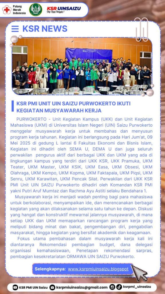 PURWOKERTO – Unit Kegiatan Kampus (UKK) dan Unit Kegiatan Mahasiswa (UKM) di Universitas Islam Negeri (UIN) Saizu Purwokerto menggelar musyawarah kerja untuk membahas dan menyusun program kerja tahunan. Kegiatan ini berlangsung pada Hari Jum’at, 09 Mei 2025 di gedung L lantai 6 Fakultas Ekonomi dan Bisnis Islam, Kegiatan ini dihadiri oleh SEMA U, DEMA U dan juga seluruh perwakilan pengurus aktif dari berbagai UKK dan UKM yang ada di lingkungan kampus yang terdiri dari UKK KSR, UKK Pramuka, UKM Teater, UKM Master, UKM KSIK, UKM Easa, UKM Obsesi, UKM Olahraga, UKM Kempo, UKM Kopma, UKM Faktapala, UKM Piqsi, UKM Senru, UKM Karawitan, UKM Pencak Silat. Perwakilan dari UKK KSR PMI Unit UIN SAIZU Purwokerto dihadiri oleh Komandan KSR PMI Unit UIN SAIZU yakni Putri Aruf Mumtaz dan Rachma Ayu Astiti selaku Bendahara 1.