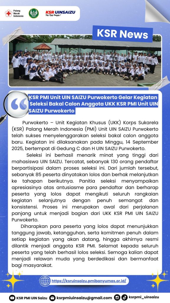 Purwokerto – Unit Kegiatan Khusus (UKK) Korps Sukarela (KSR) Palang Merah Indonesia (PMI) Unit UIN SAIZU Purwokerto telah sukses menyelenggarakan seleksi bakal calon anggota baru. Kegiatan ini dilaksanakan pada Minggu, 14 September 2025, bertempat di Gedung C dan H UIN SAIZU Purwokerto.
