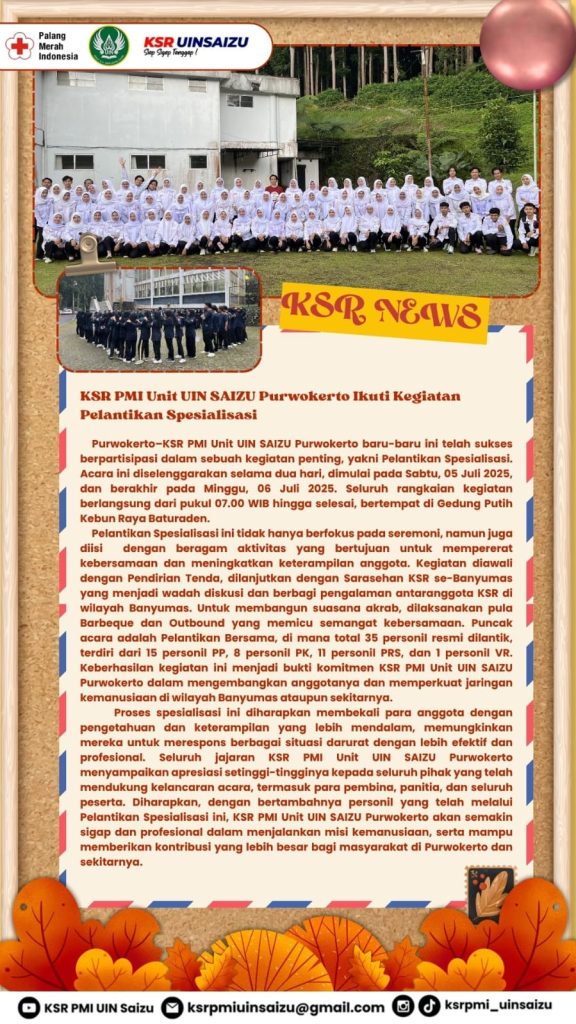 Purwokerto– KSR PMI Unit UIN SAIZU Purwokerto baru-baru ini telah sukses berpartisipasi dalam sebuah kegiatan penting, yakni Pelantikan Spesialisasi. Acara ini diselenggarakan selama dua hari, dimulai pada Sabtu, 05 Juli 2025, dan berakhir pada Minggu, 06 Juli 2025. Seluruh rangkaian kegiatan berlangsung dari pukul 07.00 WIB hingga selesai, bertempat di Gedung Putih Kebun Raya Baturaden.