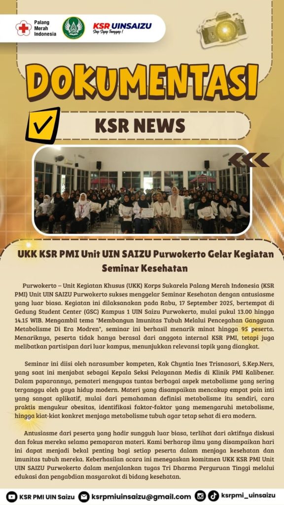 Purwokerto – Unit Kegiatan Khusus (UKK) Korps Sukarela Palang Merah Indonesia (KSR PMI) Unit UIN SAIZU Purwokerto sukses menggelar Seminar Kesehatan dengan antusiasme yang luar biasa. Kegiatan ini dilaksanakan pada Rabu, 17 September 2025, bertempat di Gedung Student Center (GSC) Kampus 1 UIN Saizu Purwokerto, mulai pukul 13.00 hingga 14.15 WIB.