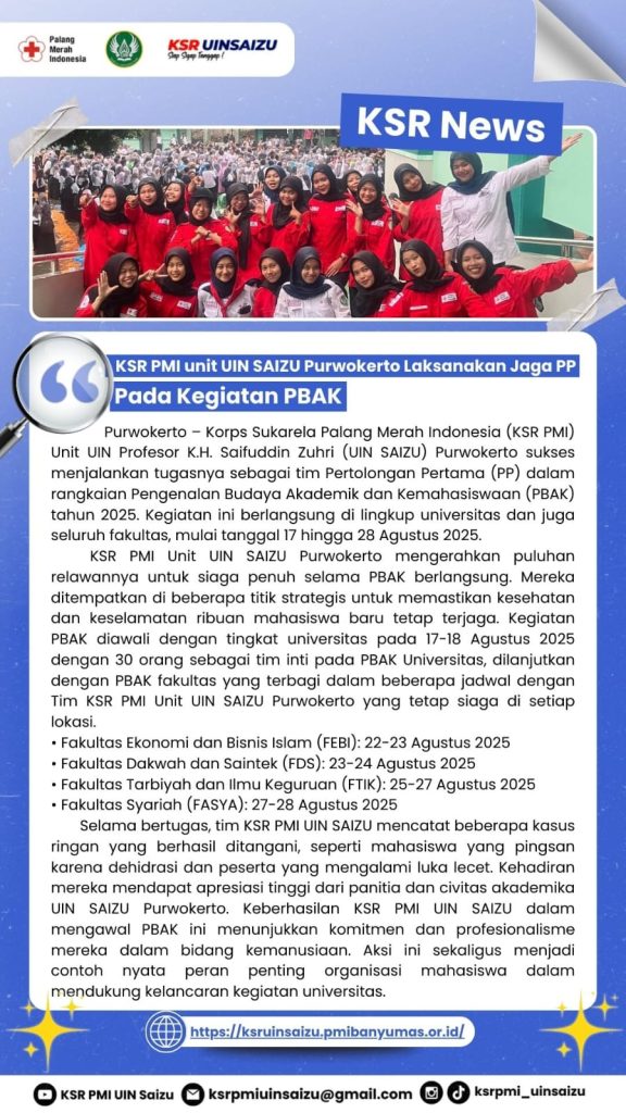 Purwokerto – Korps Sukarela Palang Merah Indonesia (KSR PMI) Unit UIN Profesor K.H. Saifuddin Zuhri (UIN SAIZU) Purwokerto sukses menjalankan tugasnya sebagai tim Pertolongan Pertama (PP) dalam rangkaian Pengenalan Budaya Akademik dan Kemahasiswaan (PBAK) tahun 2025. Kegiatan ini berlangsung di lingkup universitas dan juga seluruh fakultas, mulai tanggal 17 hingga 28 Agustus 2025.