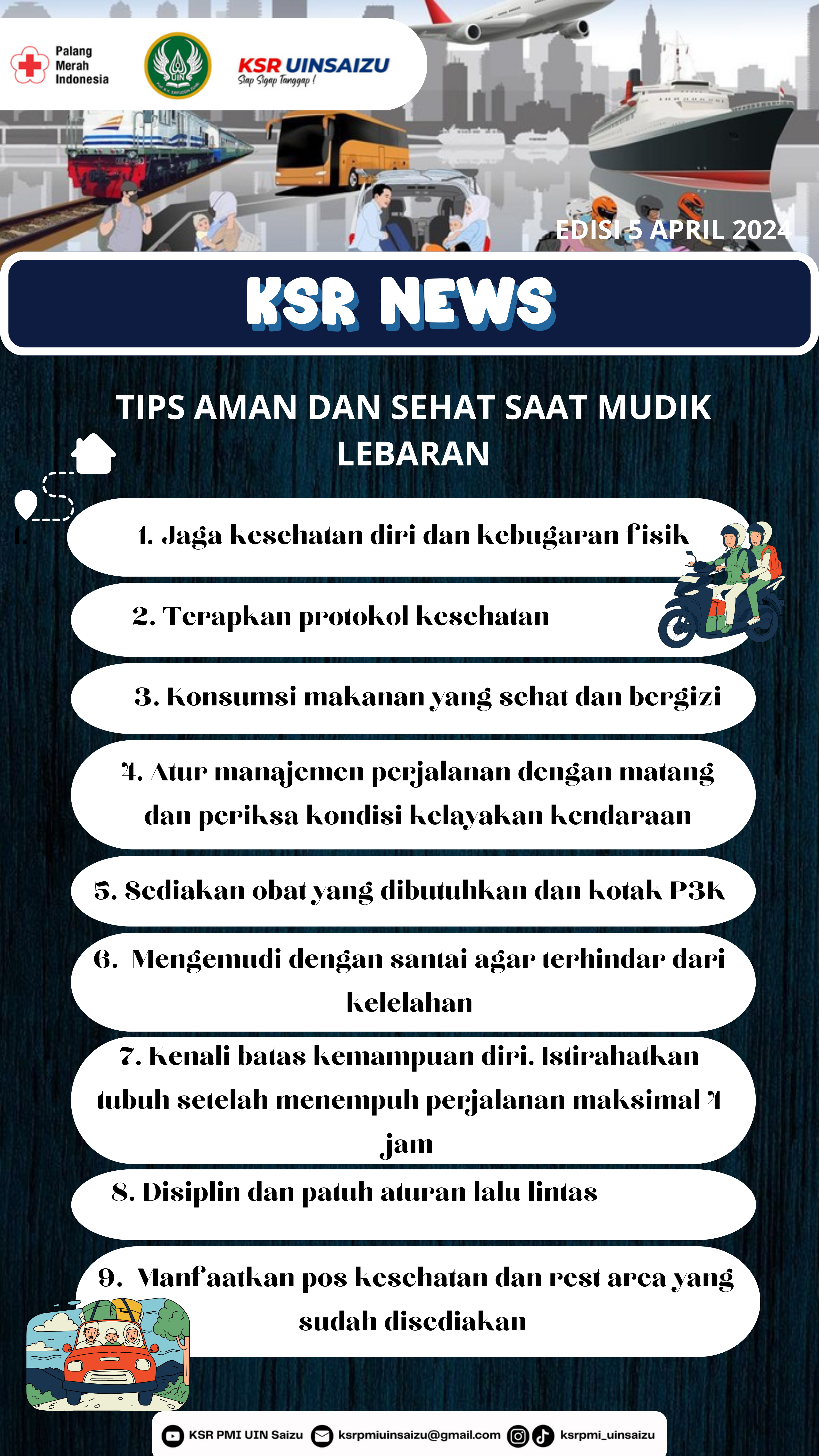 Patuhi batas kecepatan dan aturan lalu lintas lainnya. Hindari berkendara secara agresif atau terlalu cepat dan gunakan sabuk pengaman. - Manfaatkan pos kesehatan dan rest area yang sudah disediakan