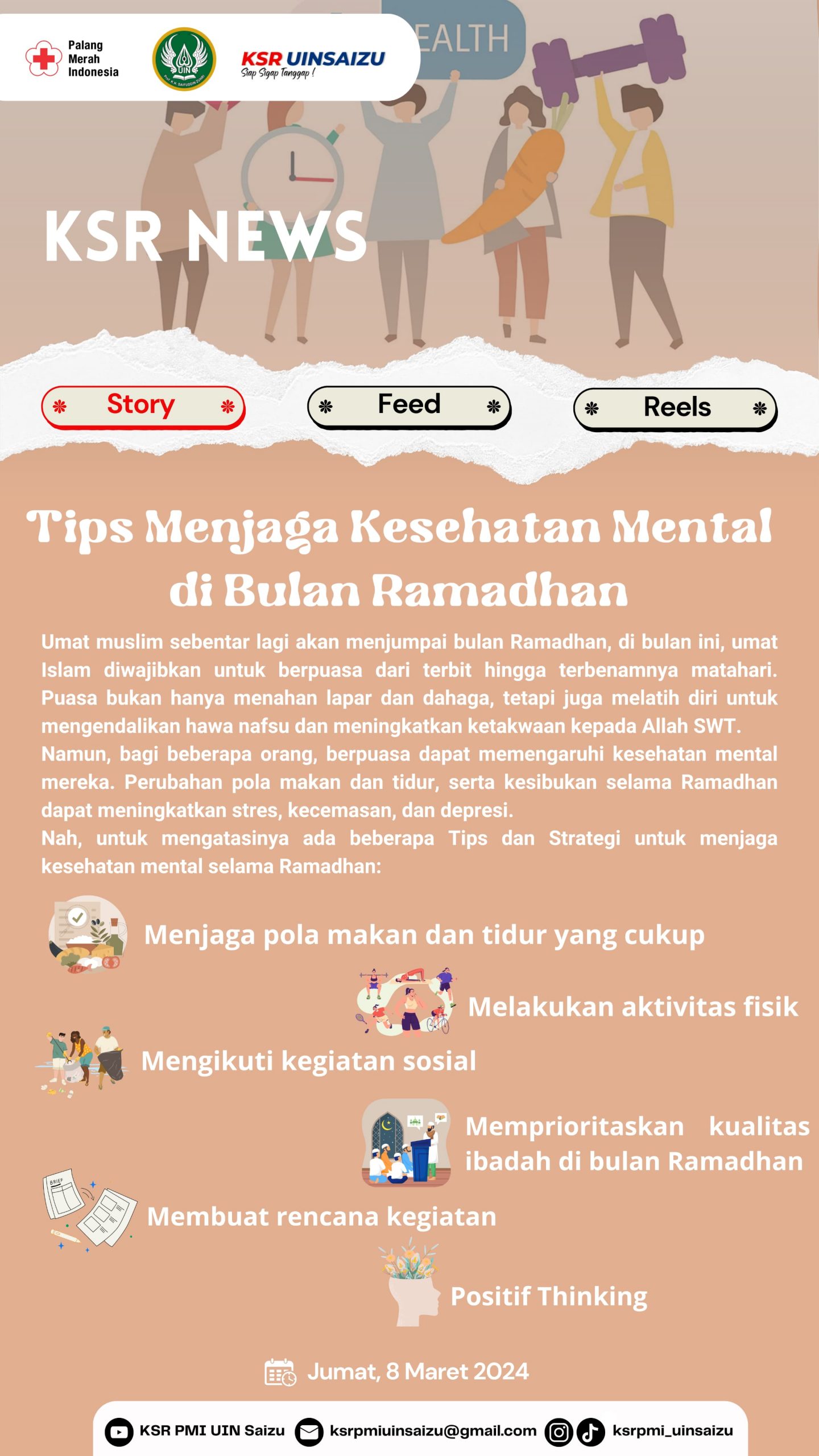 Dari informasi diatas kita jadi tau tips dan strategi menjaga kesehatan mental selama bulan Ramadhan, sehingga kita bisa menjalani bulan Ramadhan ini dengan penuh hikmat dan sukacita. Oleh karena itu sobat KSR PMI UIN Prof. K. H. Saifuddin Zuhri Purwokerto di mana pun berada bisa menerapkan tips dan strategi ini untuk menjaga kesehatan mental selama bulan Ramadhan.